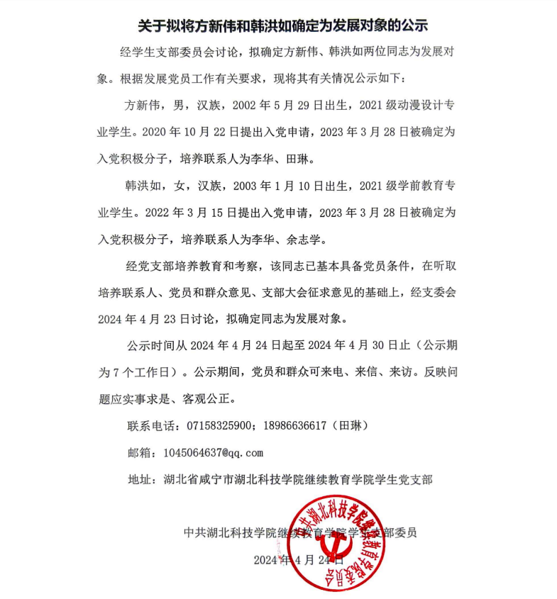 ac米兰官方网站学生支部关于拟将方新伟和韩洪如确定为发展对象的公示