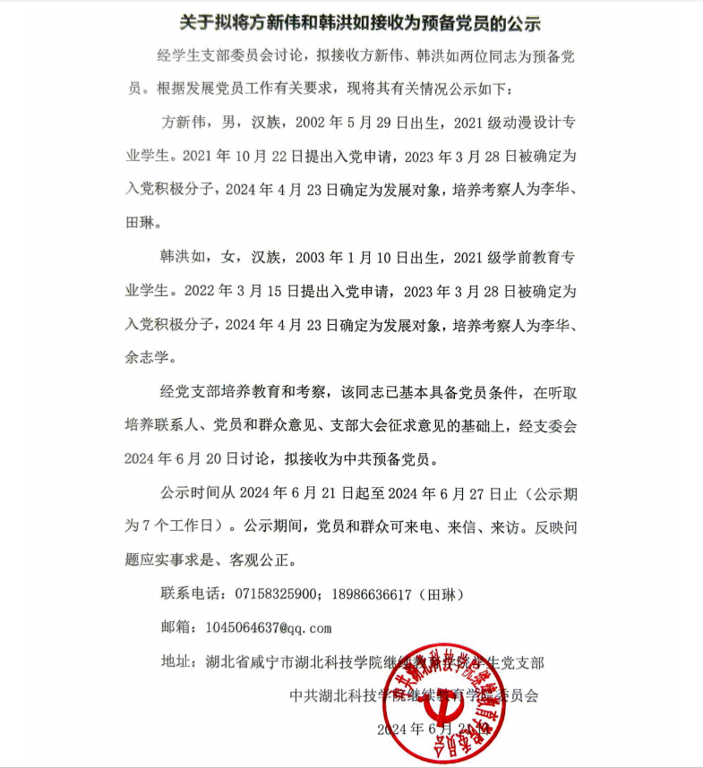 ac米兰官方网站学生支部关于拟将方新伟和韩洪如接收为预备党员的公示