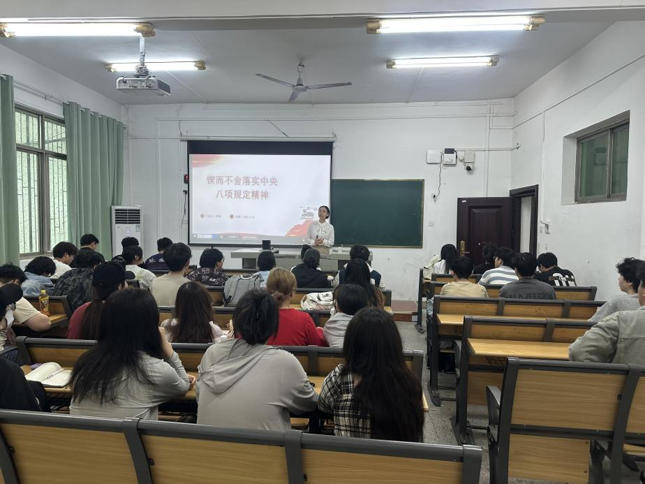 学习研讨结束后,田琳同志在教一103教室以《锲而不舍落实中央八项规定精神》为主题,开展专题党课。全体党员、学生干部、入党积极分子参加。课上,紧紧围绕中央八项规定出台的时代背景、核心内容及重大意义进行了全面解读,并结合典型案例,深入浅出地剖析了违反八项规定精神的具体表现,引导学生干部从思想根源上深刻认识作风建设的重要性和紧迫性。同时,她还联系实际,围绕“校园内如何杜绝形式主义活动”“学生干部工作中怎样避免官僚主义倾向”等主题,以提问、解答、案例分析相结合的方式,带领党员们深入思考。同学们专注聆听、认真记录,现场学习氛围浓厚。