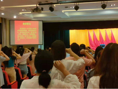 最后,全体参会人员进行集体宣誓,齐读教师誓词,铿锵有力的声音代表大家积极献身教育事业的坚定决心。
